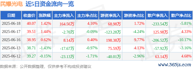 6月18日的资金流向数据方面,主力资金净流入164.56万元,占总成交额4.1%,游资资金净流入68.98万元,占总成交额1.72%,散户资金净流出233.54万元,占总成交额5.81%。